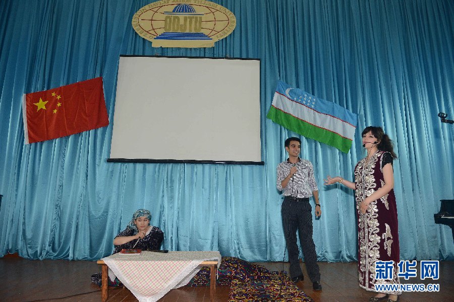 6月9日,學(xué)生代表在烏茲別克斯坦首都塔什干的烏世界語言大學(xué)禮堂表演節(jié)目。
