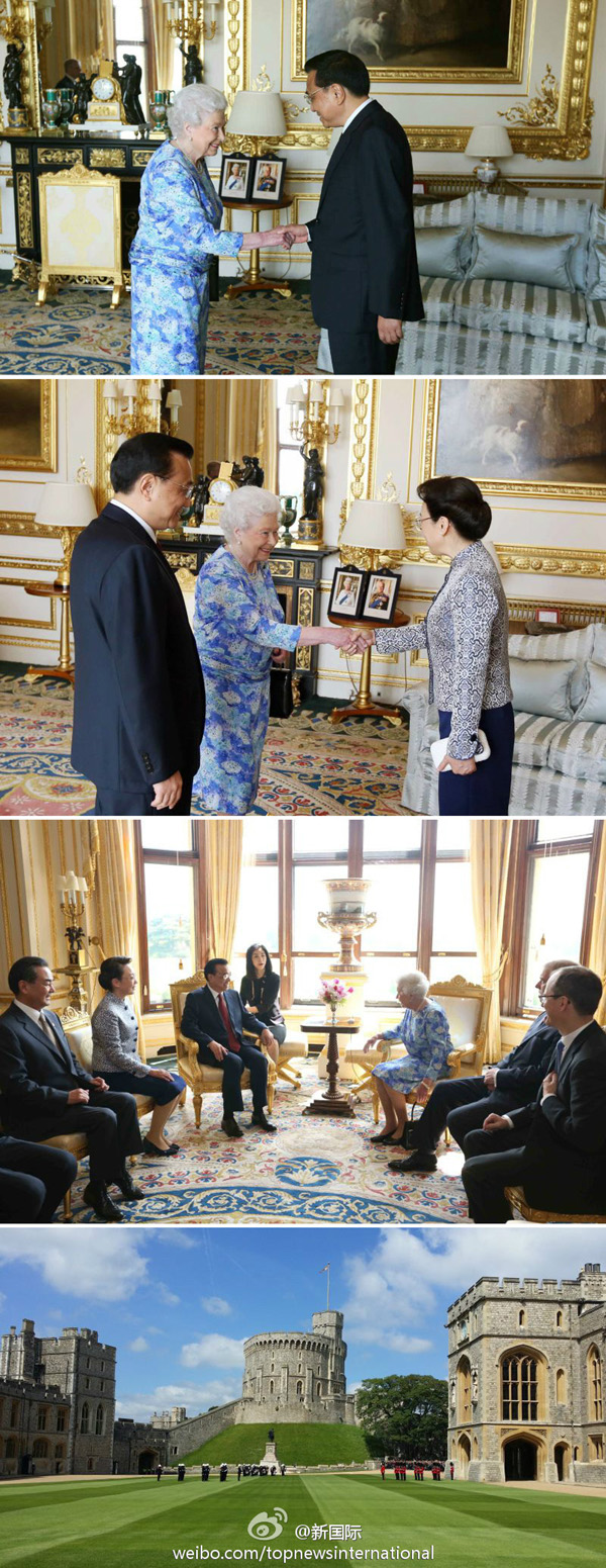 新華網(wǎng)北京6月17日電 據(jù)新華社“新國際”微博報道, 國務(wù)院總理李克強17日上午在溫莎宮會見英國女王伊麗莎白二世。李克強說,中英兩國堪稱東西方文明的代表,我們愿與英方互學(xué)互鑒。中國歡迎英國王室成員多到中國走一走,看一看。女王愉快回憶起1986年訪華時情景,稱中國之行給她留下深刻印象。