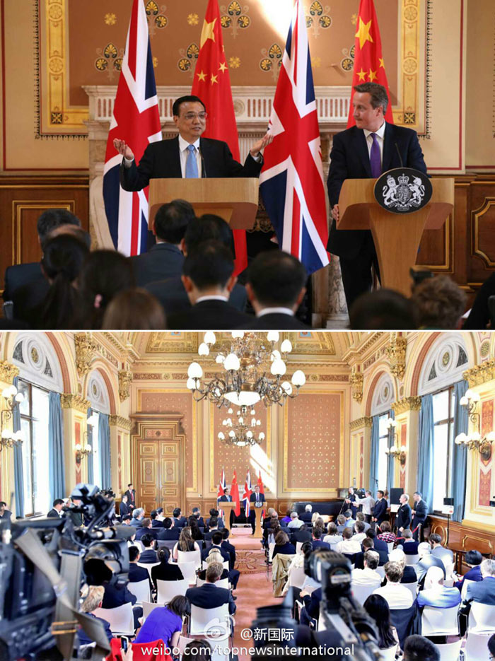 ???? 新華網(wǎng)北京6月18日電 據(jù)新華社“新國際”微博報道,17日李克強與卡梅倫共見記者時說,今天陽光明媚是個好日子,英國有句諺語:把握一個今天,勝似兩個明天。中國也常說“時不我待”。中英合作基礎(chǔ)好、潛力大,雙方有責任搶抓機遇,規(guī)劃新路線,鋪設(shè)快車道,使兩國關(guān)系明天更加燦爛。