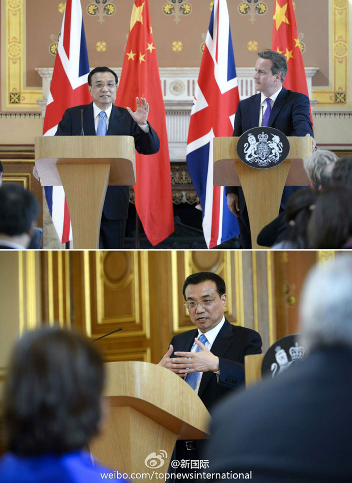 ??? 新華網(wǎng)北京6月18日電 據(jù)新華社“新國際”微博報道,17日,李克強與卡梅倫共見記者。李克強說,中英共同設(shè)立總額2億英鎊的科學(xué)基金,以加強聯(lián)合科學(xué)創(chuàng)新合作,第一個合作項目就是太空項目,這顯示了“我們合作的雄心”。未來5年中國將向英派遣1萬名公費留學(xué)生,也歡迎英國向中國派遣更多留學(xué)生。