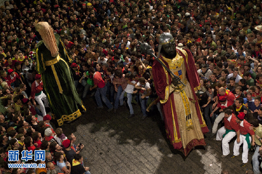 西班牙貝爾加(Berga)市的La Patum節(jié)上,巨大的人偶穿過狂歡的人群。