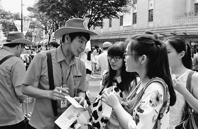 圖為中文旅游咨詢員李潤雨(左二)正在熱心地為中國游客指路。本報記者 萬宇攝