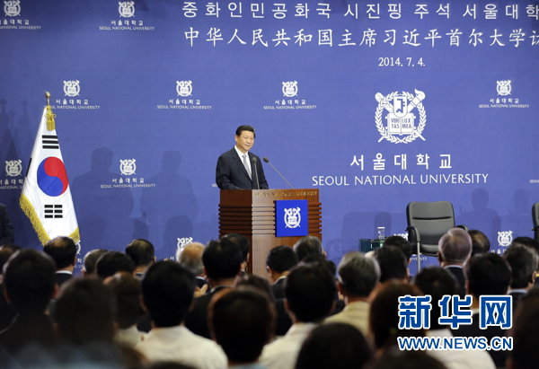 ???? 7月4日,國家主席習(xí)近平在韓國國立首爾大學(xué)發(fā)表題為《共創(chuàng)中韓合作未來 同襄亞洲振興繁榮》的重要演講。 新華社記者 丁林 攝