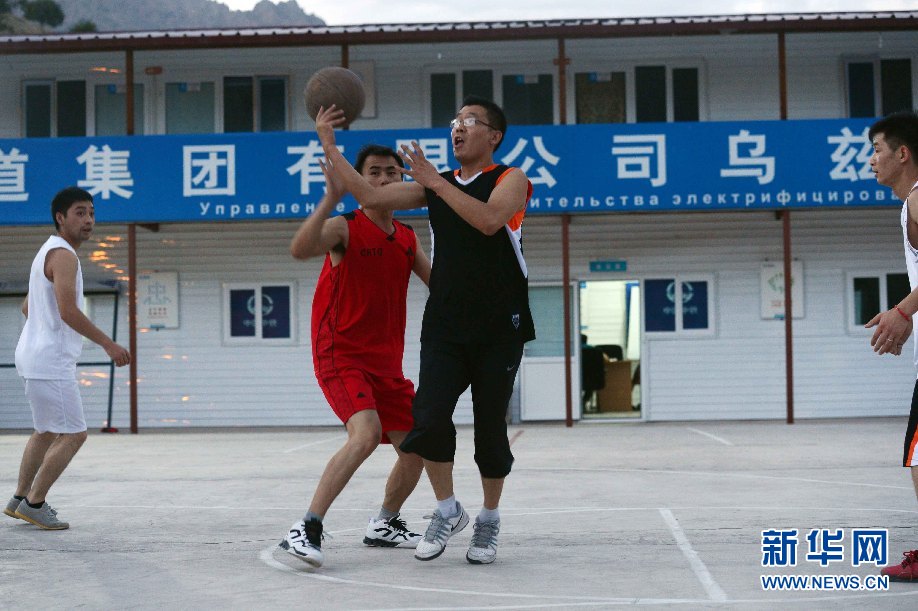 ????7月5日,烏茲別克斯坦安革連至琶布鐵路隧道項(xiàng)目安革連隧道進(jìn)口西口分部,員工在打籃球。(沙達(dá)提 攝)