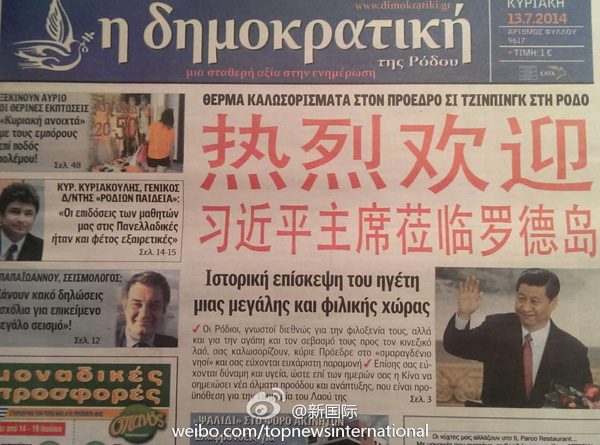 ????新華網(wǎng)北京7月14日電 據(jù)新華社“新國際”微博報道,希臘羅德島報紙《民主報》13日在頭版發(fā)表題為《一個偉大友好國家領(lǐng)導(dǎo)人的歷史性訪問》文章,并用中文紅色大字體寫著“熱烈歡迎習(xí)近平主席蒞臨羅德島”。文章說,熱情好客的羅德島人民祝愿習(xí)近平主席身體健康,祝愿中國在習(xí)主席領(lǐng)導(dǎo)下取得跨越式發(fā)展,祝愿中國繁榮昌盛。