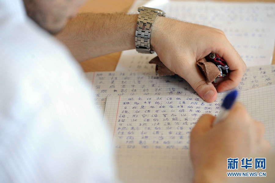 ??? 6月25日,烏茲別克斯坦首都塔什干,烏國立世界語言大學教室,70歲的董富華在向三年級學生上漢語課。新華網(wǎng)記者 沙達提攝。