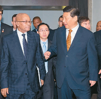 習近平表示,當前,中南關系正面臨重要發(fā)展機遇期,合作潛力巨大,我們應該乘勢而上,努力推動中南關系再上新臺階。我歡迎祖馬總統(tǒng)下半年訪華,共同制定未來合作規(guī)劃。雙方要積極開展能源、礦業(yè)、農業(yè)、裝備制造、基礎設施建設、鐵路機車、核電等領域合作,中方愿繼續(xù)配合南非辦好2014年中國南非年活動。