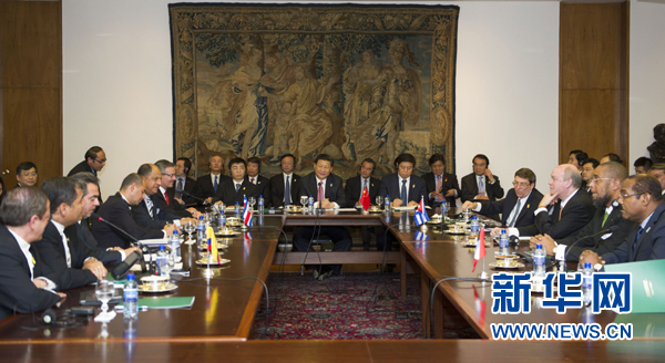??? 當(dāng)?shù)貢r(shí)間7月17日,國家主席習(xí)近平在巴西利亞會見拉美和加勒比國家共同體輪值主席國哥斯達(dá)黎加總統(tǒng)索利斯、前任輪值主席國古巴國務(wù)委員會主席兼部長會議主席勞爾·卡斯特羅、候任輪值主席國厄瓜多爾總統(tǒng)科雷亞、加勒比共同體輪值主席國安提瓜和巴布達(dá)總理布朗。新華社記者 謝環(huán)馳 攝