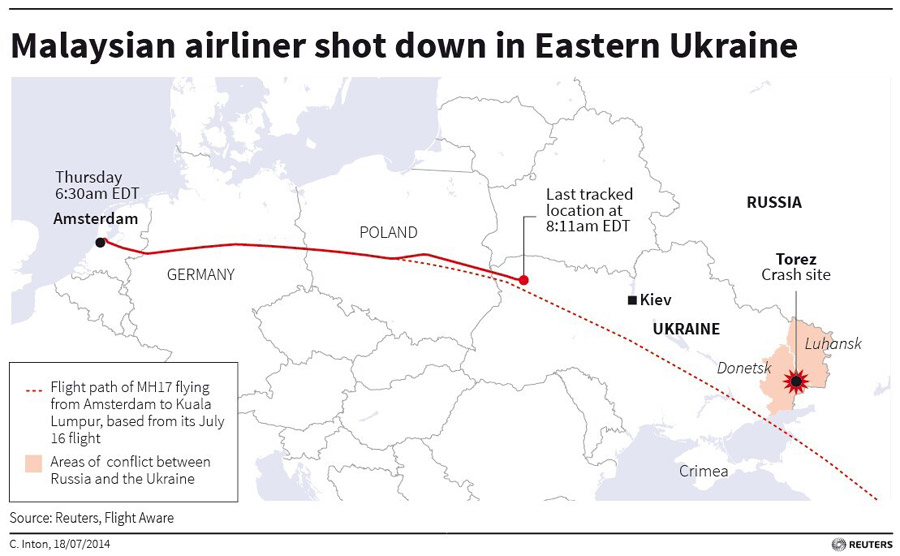 當(dāng)?shù)貢r(shí)間7月17日,一架從阿姆斯特丹起飛的馬航客機(jī)在烏克蘭領(lǐng)空與地面失去聯(lián)系。這架飛機(jī)墜毀在烏克蘭頓涅茨克州斯涅日諾耶居民點(diǎn)附近,機(jī)上298人全部遇難。英國(guó)路透社繪制了一張客機(jī)路線圖。
