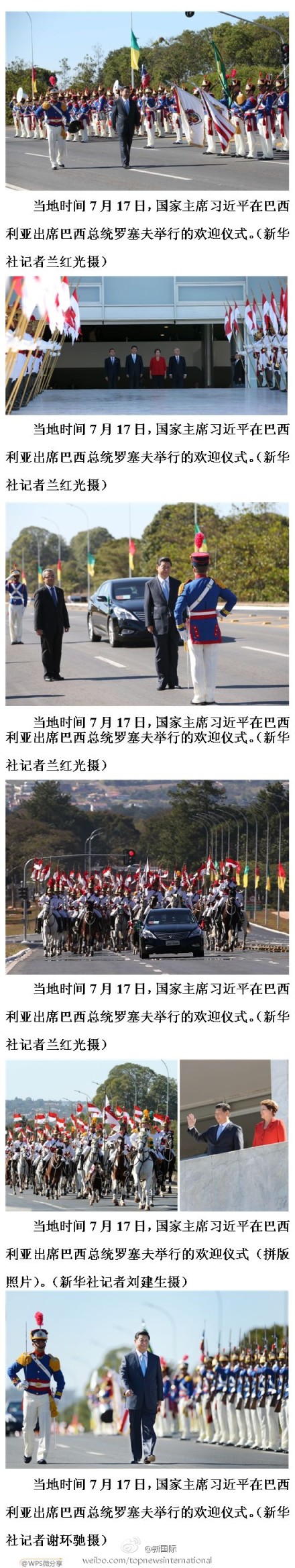 ????新華網(wǎng)北京7月18日電 據(jù)新華社“新國(guó)際”微博報(bào)道,17日,巴西總統(tǒng)羅塞夫?yàn)榱?xí)近平舉行隆重歡迎儀式。在總統(tǒng)府入口處,習(xí)近平與羅塞夫親切握手、問(wèn)候。軍樂(lè)團(tuán)奏中巴國(guó)歌,升中國(guó)國(guó)旗,鳴禮炮21響。隨后,兩位元首一同登上觀禮臺(tái),觀看儀仗隊(duì)分列式。騎兵馬隊(duì)簇?fù)碇娖?,奔騰跳躍,奮蹄疾馳。?
