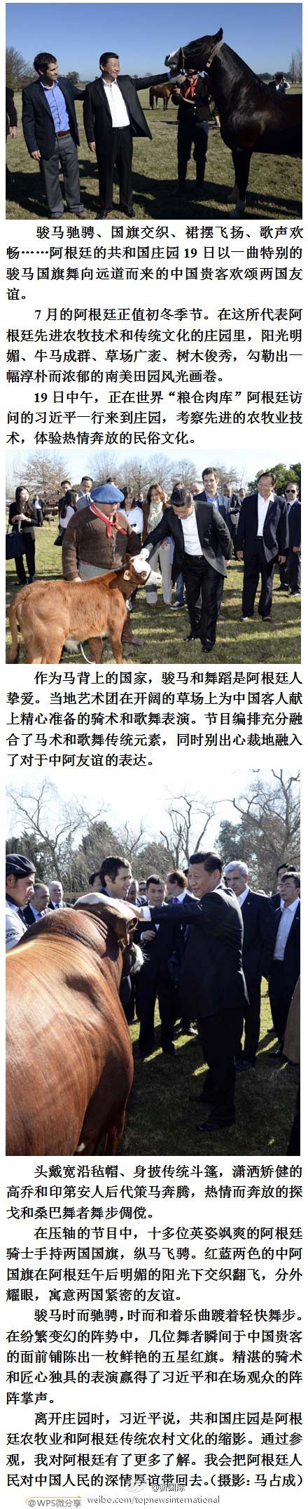 ??? 新華網(wǎng)北京7月20日電 據(jù)新華社“新國(guó)際”微博報(bào)道,駿馬馳騁、國(guó)旗交織、裙擺飛揚(yáng)、歌聲歡暢……阿根廷的共和國(guó)莊園19日以一曲特別的駿馬國(guó)旗舞向遠(yuǎn)道而來的中國(guó)貴客歡頌兩國(guó)友誼。