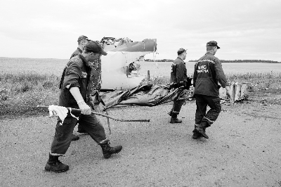 19日,在烏克蘭頓涅茨克州的MH17航班墜機(jī)現(xiàn)場(chǎng),救援人員搬運(yùn)遇難者遺體圖/新華社