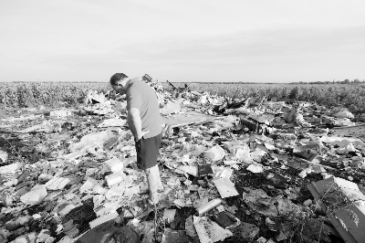 19日,在烏克蘭頓涅茨克州,一名當(dāng)?shù)孛癖娬驹隈R航MH17航班墜機(jī)現(xiàn)場(chǎng) 圖/新華社