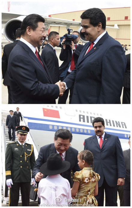 ????新華網北京7月21日電 據(jù)新華社“新國際”微博報道,經過近7小時飛行,習近平主席當?shù)貢r間20日下午飛抵加拉加斯。專機進入委領空后,委空軍2架蘇-30戰(zhàn)機升空護航。馬杜羅總統(tǒng)親自到機場迎接。隨后,歡迎儀式在機場隆重舉行,習近平在馬杜羅陪同下檢閱儀仗隊。