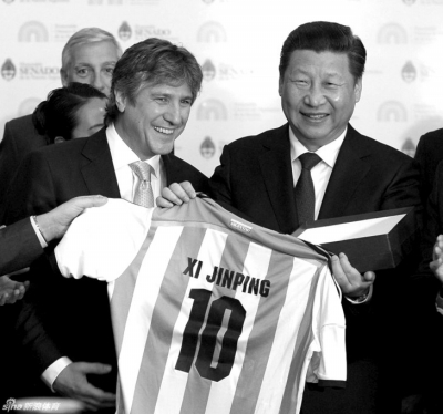 ????在和阿根廷副總統(tǒng)兼參議長布杜及眾議長多明格斯舉行會(huì)談時(shí),習(xí)近平特別提到阿根廷足球隊(duì)在世界杯奪得亞軍,他說:“剛才眾議長先生問我是否喜歡足球,我說我非常喜歡足球。他也祝愿中國能夠早日舉辦一屆世界杯,這正是我的愿望。但是我們足球的發(fā)展,還希望同阿根廷加強(qiáng)交流合作,靠你們的幫助,提高我們的水平?!?/p>