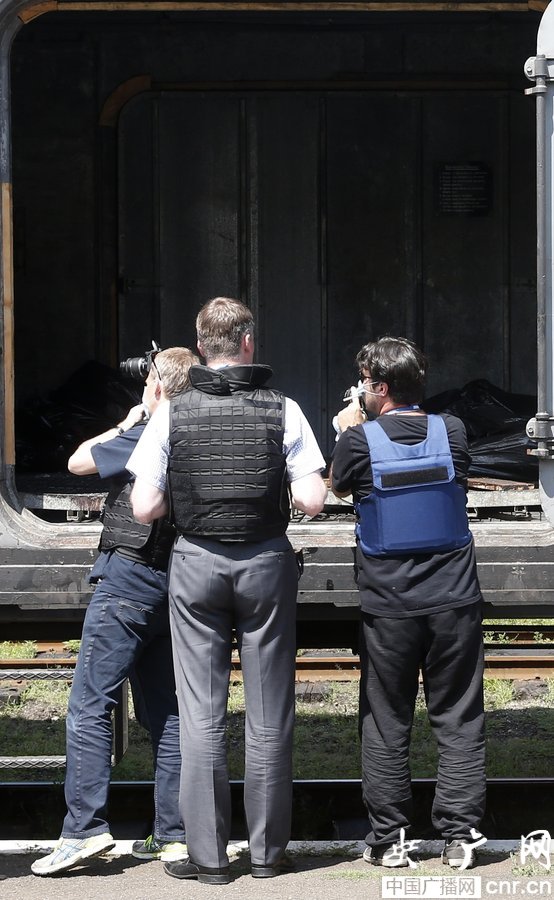 當(dāng)?shù)貢r(shí)間2014年7月20日,烏克蘭頓涅茨克Torez,馬航墜機(jī)遇難乘客遺體被裝上列車?yán)洳剀噹麑⒈贿\(yùn)走。載有部分遺體的火車從距空難現(xiàn)場(chǎng)不遠(yuǎn)的烏克蘭托列茲市出發(fā),前往頓涅茨克市?;疖囯x站前,身處空難現(xiàn)場(chǎng)的歐洲安全與合作組織(歐安組織)代表檢查了運(yùn)載遺體的5節(jié)冷藏車廂。