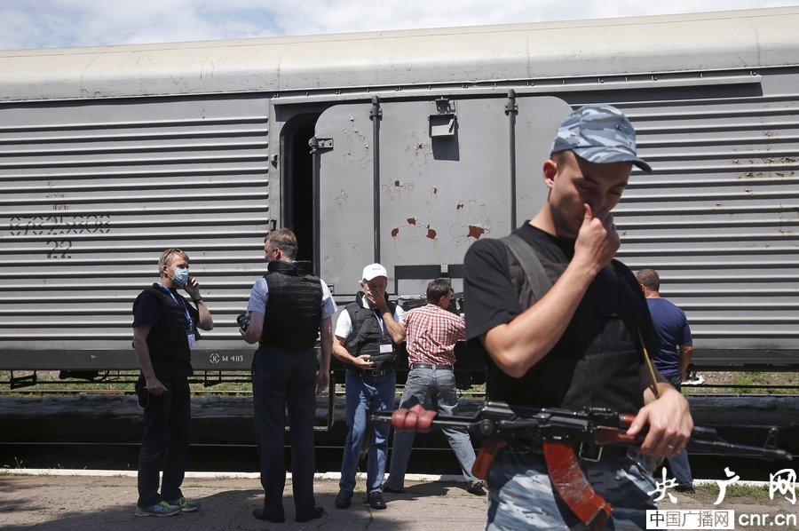 當(dāng)?shù)貢r(shí)間2014年7月20日,烏克蘭頓涅茨克Torez,馬航墜機(jī)遇難乘客遺體被裝上列車?yán)洳剀噹麑⒈贿\(yùn)走。載有部分遺體的火車從距空難現(xiàn)場不遠(yuǎn)的烏克蘭托列茲市出發(fā),前往頓涅茨克市?;疖囯x站前,身處空難現(xiàn)場的歐洲安全與合作組織(歐安組織)代表檢查了運(yùn)載遺體的5節(jié)冷藏車廂。