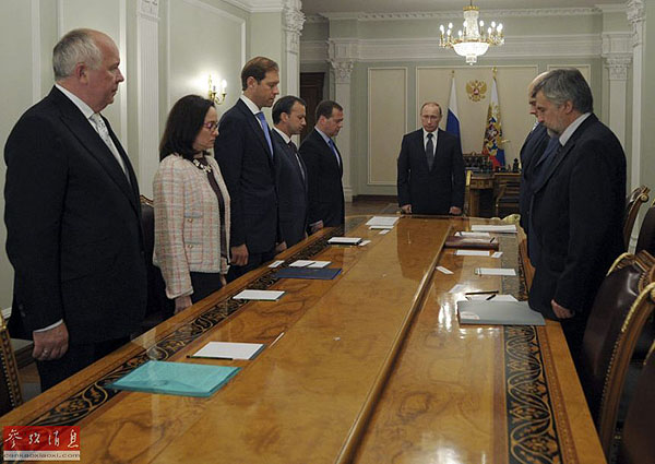 7月17日夜,在俄羅斯莫斯科州新奧加廖沃官邸,俄羅斯總統(tǒng)普京(后)和一些高級別官員在經(jīng)濟問題會議前為墜毀馬航MH17航班的遇難者默哀。普京當(dāng)晚說,馬航客機失事悲劇發(fā)生在烏克蘭領(lǐng)空,烏克蘭無疑對此承擔(dān)責(zé)任。