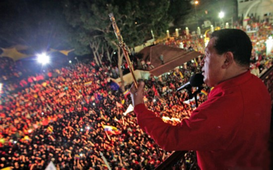 ????2012年10月7日,在得知自己成功當(dāng)選總統(tǒng)后,查韋斯面對(duì)支持者們舉起了玻利瓦爾之劍