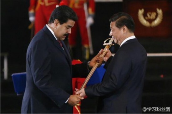 ????2014年7月20日,馬杜羅向習(xí)近平授予象征自由、主權(quán)、獨(dú)立的玻利瓦爾劍