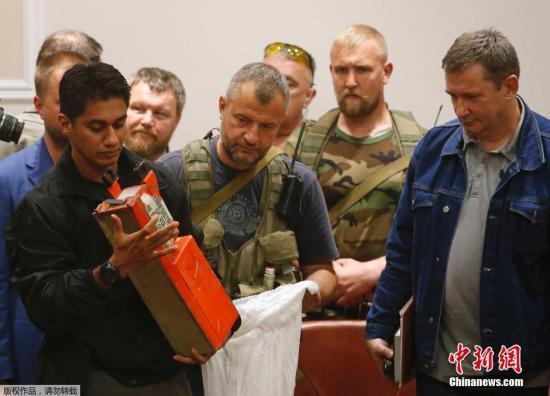 當?shù)貢r間2014年7月22日,頓涅茨克,“頓涅茨克人民共和國”官員向馬來西亞調查人員移交馬航MH17航班客機黑匣子。
