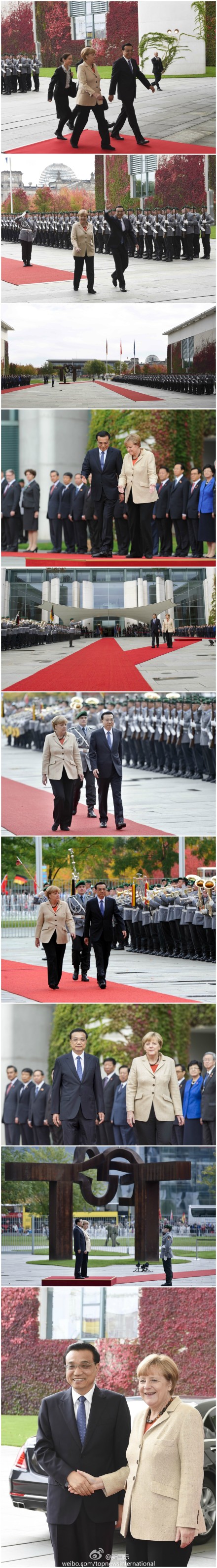 ????新華網(wǎng)北京10月10日電 據(jù)新華社“新國際”微博報(bào)道,當(dāng)?shù)貢r(shí)間10月10日,德國總理默克爾在總理府舉行隆重歡迎儀式,歡迎李克強(qiáng)總理的來訪。儀式上奏起兩國國歌,李克強(qiáng)在默克爾陪同下檢閱了儀仗隊(duì)。