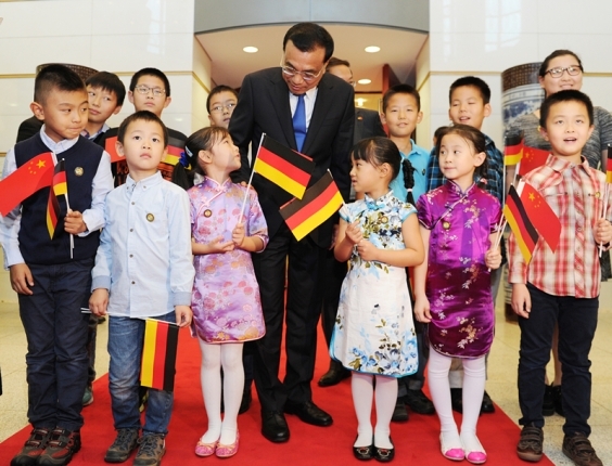 克強(qiáng)總理問(wèn)了問(wèn)孩子們的年齡、年級(jí),又跟學(xué)校老師聊起孩子們的學(xué)習(xí)情況,與大家一起合影,鼓勵(lì)孩子們“做中德交往的橋梁”。