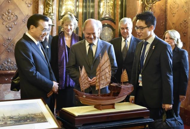 漢堡市政廳里,克強(qiáng)總理將一艘明代商船的復(fù)制模型,贈給漢堡市市長肖爾茨。