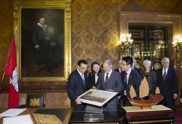 “這是一艘明代的商船,它曾到過非洲的東海岸,可惜沒能來到漢堡,不過它眺望過漢堡,現(xiàn)在終于來到漢堡了,”克強(qiáng)總理說。肖爾茨贈給克強(qiáng)總理的是一幅描繪漢堡市中心風(fēng)景的圖畫。