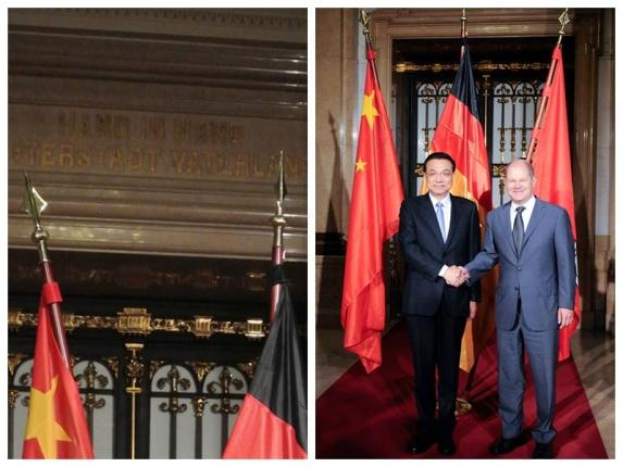 市政廳里,站在代表中國、德國和漢堡的三面旗幟前,克強(qiáng)總理與肖爾茨市長的手緊緊相握。在他們的身后,大門門楣上鐫刻著這樣一句話“hand in hand”。