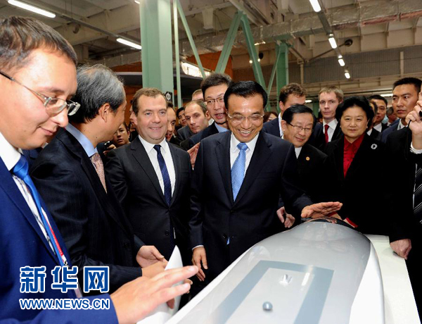 ????中國科技與創(chuàng)新展區(qū)集中展示了中國高速鐵路機車、核電、航天、高端制造和通信等領(lǐng)域的科研成果。在高速動車展臺前,李克強和梅德韋杰夫聽取項目負(fù)責(zé)人介紹中國自主研發(fā)的新一代高速動車組。梅德韋杰夫詢問,這種高鐵是否能在高寒地區(qū)運行。李克強說,中國高鐵擁有在高寒地區(qū)運行的豐富經(jīng)驗,技術(shù)有保障。