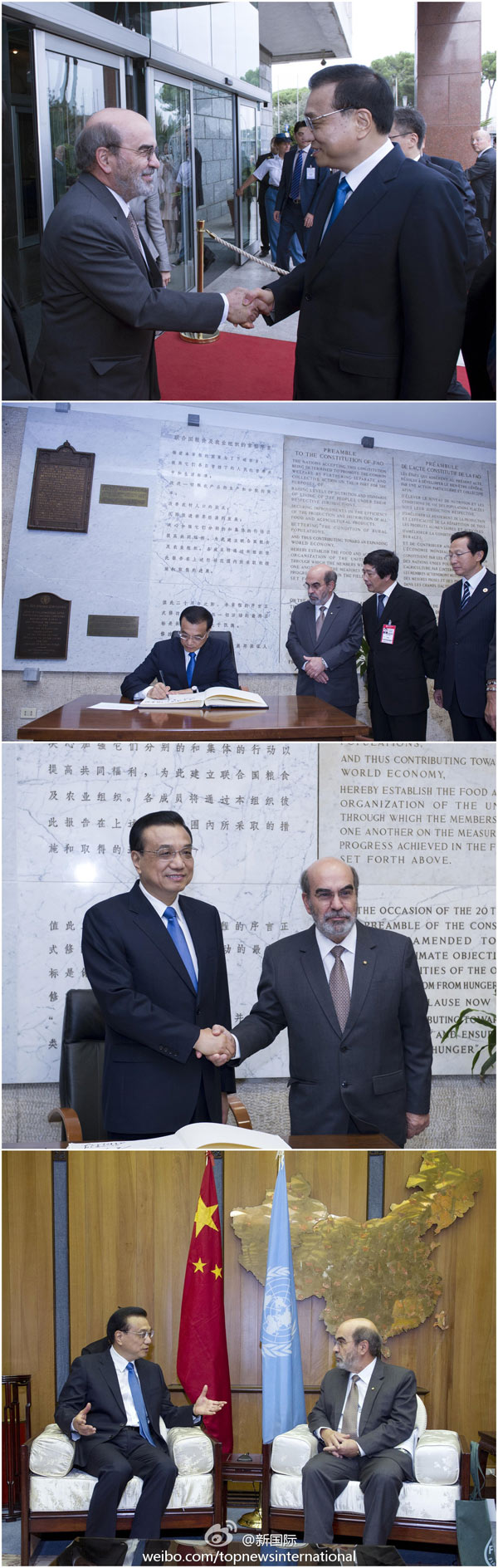 ????新華網(wǎng)北京10月15日電 據(jù)新華社“新國際”微博報(bào)道,應(yīng)聯(lián)合國糧農(nóng)組織總干事格拉齊亞諾的邀請,李克強(qiáng)總理在世界糧食日前夕,來到位于羅馬的糧農(nóng)組織總部訪問,與格拉齊亞諾會(huì)見并發(fā)表演講。這是李克強(qiáng)就任總理后首訪聯(lián)合國組織,也是中國總理首次訪問糧農(nóng)組織總部。