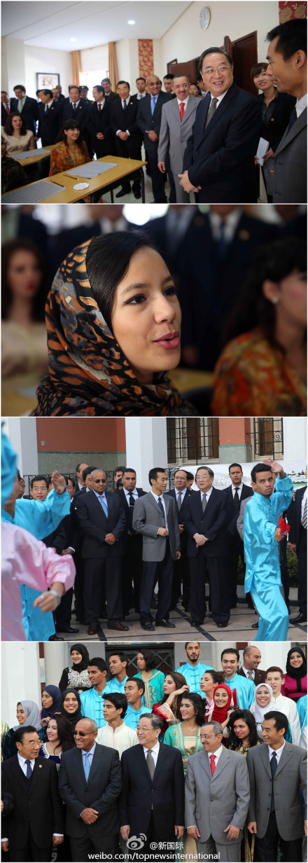 ??? 新華網(wǎng)北京11月6日電 據(jù)新華社“新國(guó)際”微博報(bào)道,全國(guó)政協(xié)主席俞正聲5日參觀摩洛哥穆罕默德五世大學(xué)孔子學(xué)院,身著摩中兩國(guó)民族服裝的當(dāng)?shù)貙W(xué)生誦唐詩(shī)、打太極、跳《小蘋果》歡迎。俞正聲走進(jìn)課堂對(duì)學(xué)生說(shuō):“你們是中摩友好的未來(lái)。希望大家用心學(xué)好中文,促進(jìn)合作交流?!?(記者李拯宇 攝影劉衛(wèi)兵)