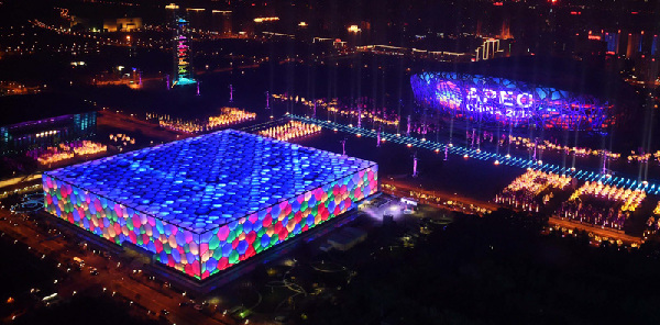 17時(shí)40分許,水立方和鳥巢的彩燈已經(jīng)在夜色中閃亮。當(dāng)晚,國家主席習(xí)近平和夫人彭麗媛在北京國家游泳中心(水立方)舉行宴會(huì),歡迎出席APEC會(huì)議的各成員經(jīng)濟(jì)體領(lǐng)導(dǎo)人或代表及配偶。