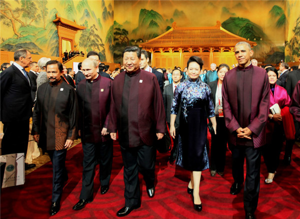 ????18時(shí)許,與會(huì)貴賓穿著為本次會(huì)議專門設(shè)計(jì)的特色中式服裝陸續(xù)抵達(dá)。習(xí)主席說,貴賓們都穿著中國式服裝,讓大家更感親近,就像到鄰居家串門,來朋友家敘舊一樣。