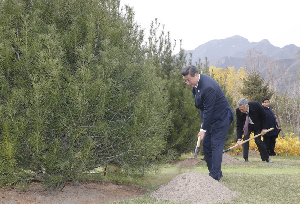 11時(shí)40分許,習(xí)主席與各成員經(jīng)濟(jì)體領(lǐng)導(dǎo)人或代表前往植樹。習(xí)主席在開幕辭中希望,亞太經(jīng)濟(jì)體以北京雁棲湖為新的起點(diǎn),引領(lǐng)世界經(jīng)濟(jì)的雁陣,飛向更加蔚藍(lán)而遼闊的天空。