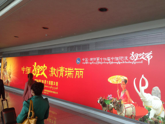 11月10日,記者在昆明長(zhǎng)水國(guó)際機(jī)場(chǎng)轉(zhuǎn)機(jī)前往緬甸時(shí)在機(jī)場(chǎng)拍下的中緬胞波狂歡節(jié)宣傳廣告。(新華社記者 桂濤攝)