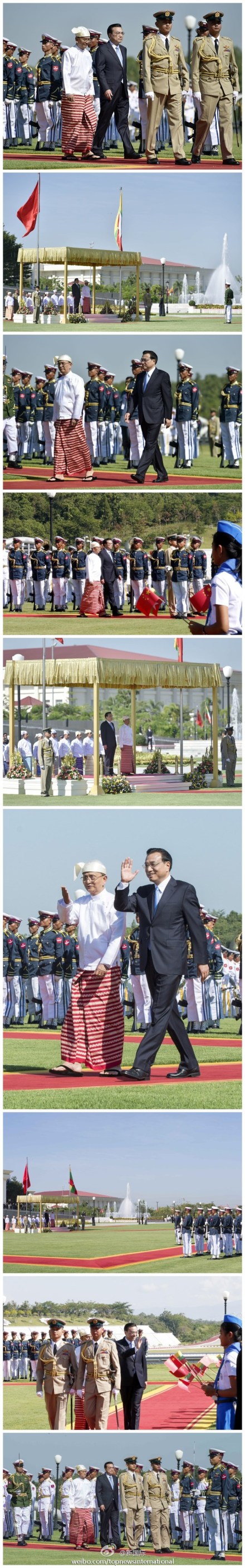 ??? 新華網(wǎng)北京11月14日電 據(jù)新華社“新國際”微博報(bào)道,緬甸總統(tǒng)吳登盛14日在內(nèi)比都總統(tǒng)府前廣場舉行隆重儀式,歡迎中國國務(wù)院總理李克強(qiáng)對緬甸進(jìn)行正式訪問。這是李克強(qiáng)就任總理以來首次訪問緬甸。