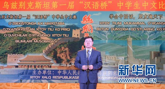 中國(guó)駐烏茲別克斯坦大使館孫立杰大使在出席烏茲別克斯坦第一屆“漢語(yǔ)橋”中學(xué)生中文比賽。