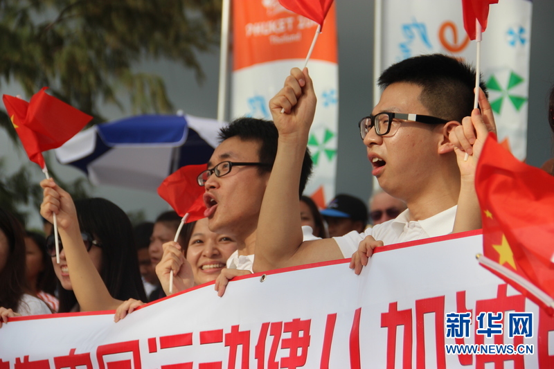 ??? 11月16日,普吉孔子學院的中國志愿者老師們?yōu)橹袊\動健兒加油。中國體育代表團16日在泰國普吉舉行的第四屆亞洲沙灘運動會上勇奪2枚金牌和2枚銅牌。當天比賽全部結束時,中國隊以3金2銀5銅的成績暫列獎牌榜第五,東道主泰國隊以9金11銀12銅的成績暫列金牌榜和獎牌榜第一。新華社記者楊云燕攝