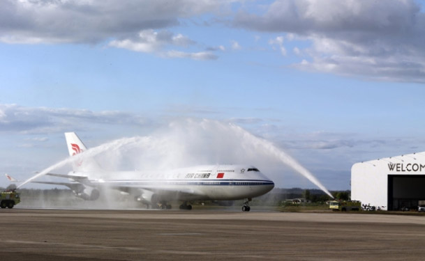 ????11月21日,習近平乘坐的專機在楠迪國際機場跑道上滑行穿過“水門”,這是當?shù)亟o予最尊貴客人的禮遇,表達為客人“洗塵”。 (攝影 丁林)