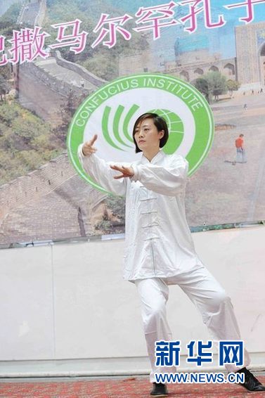 ????11月27日,烏茲別克斯坦撒馬爾罕國立外國語學院禮堂,上海外國語大學李海榮老師在表演太極拳。(新華網(wǎng)記者 沙達提 攝)