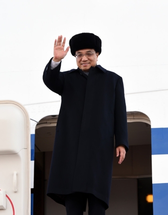 專機(jī)艙門打開,克強(qiáng)總理身著大衣,頭戴皮帽,一邊走下舷梯一邊向大家揮手致意。
