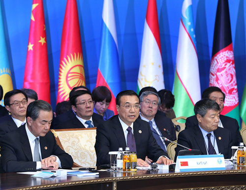 15日阿斯塔納獨(dú)立宮,克強(qiáng)總理在上合組織成員國(guó)政府首腦理事會(huì)第十三次會(huì)議大范圍會(huì)談上提出三點(diǎn)建議:筑牢地區(qū)安全穩(wěn)定屏障,打造區(qū)域合作新亮點(diǎn),更加注重民生和人文交流合作。