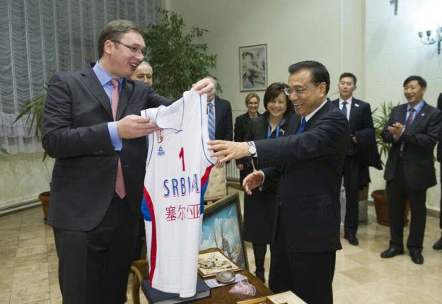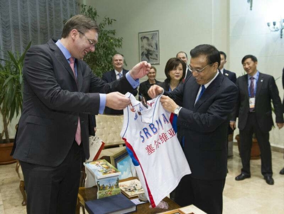 ????新華網(wǎng)北京12月18日電 據(jù)新華社“新華國際客戶端”報道,17日晚,李克強總理收到了一件特別的禮物:塞爾維亞國家籃球隊的1號球衣。武契奇總理贈送的這件白色球衣上特別寫上了李克強名字的中英文。