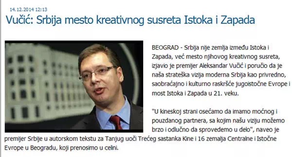 ????塞爾維亞總理武契奇14日在塞爾維亞南通社發(fā)表題為《塞爾維亞是東西方創(chuàng)造性相遇的地方》的署名文章。文章稱(chēng),塞爾維亞不是夾在東西方之間的國(guó)家,而是東西方創(chuàng)造性相遇的地方。他表示,一個(gè)現(xiàn)代化的塞爾維亞(應(yīng))成為東部歐洲經(jīng)濟(jì)、交通、文化的交叉點(diǎn)以及21世紀(jì)東西方的橋梁。他說(shuō),中國(guó)是強(qiáng)大的和值得信賴(lài)的伙伴,通過(guò)同中國(guó)的合作,塞爾維亞可以很快、堅(jiān)定地去實(shí)施自己的戰(zhàn)略預(yù)想。武契奇還引用《孫子兵法》作者孫武的話(huà)“如果你善于利用機(jī)會(huì),機(jī)會(huì)會(huì)增加”,表示賽爾維亞將緊緊抓住現(xiàn)在的機(jī)遇,為自己的發(fā)展創(chuàng)造新的機(jī)會(huì)。