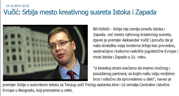 塞爾維亞總理武契奇14日在塞爾維亞南通社發(fā)表題為《塞爾維亞是東西方創(chuàng)造性相遇的地方》的署名文章。文章稱,塞爾維亞不是夾在東西方之間的國(guó)家,而是東西方創(chuàng)造性相遇的地方。他表示,一個(gè)現(xiàn)代化的塞爾維亞(應(yīng))成為東部歐洲經(jīng)濟(jì)、交通、文化的交叉點(diǎn)以及21世紀(jì)東西方的橋梁。他說,中國(guó)是強(qiáng)大的和值得信賴的伙伴,通過同中國(guó)的合作,塞爾維亞可以很快、堅(jiān)定地去實(shí)施自己的戰(zhàn)略預(yù)想。武契奇還引用《孫子兵法》作者孫武的話“如果你善于利用機(jī)會(huì),機(jī)會(huì)會(huì)增加”,表示賽爾維亞將緊緊抓住現(xiàn)在的機(jī)遇,為自己的發(fā)展創(chuàng)造新的機(jī)會(huì)。