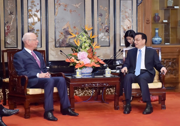 (2014年5月28日,國務(wù)院總理李克強(qiáng)在北京釣魚臺國賓館會見世界經(jīng)濟(jì)論壇主席施瓦布。新華社記者李濤攝)