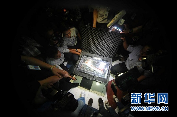 ??? 1月12日,在印度尼西亞雅加達(dá),工作人員打開裝有亞航失事客機(jī)黑匣子的箱子。印度尼西亞國(guó)家交通安全委員會(huì)主席塔唐·庫(kù)爾尼亞迪12日說(shuō),搜救人員當(dāng)天早上打撈起的失事亞航客機(jī)其中一個(gè)黑匣子——飛行數(shù)據(jù)記錄器狀態(tài)良好。新華社發(fā)(阿貢攝)
