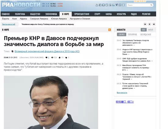 俄新社21日以《中國總理強(qiáng)調(diào)以對話促進(jìn)和平的重要性》為題報道了李克強(qiáng)總理在達(dá)沃斯論壇上的致辭。報道中援引了李克強(qiáng)“世界各國都要像愛護(hù)自己的眼睛一樣愛護(hù)和平”的說法,并指出,中國反對一切形式的恐怖主義。文章寫道,今年是世界反法西斯戰(zhàn)爭勝利70周年,李克強(qiáng)強(qiáng)調(diào)了維護(hù)戰(zhàn)后國際秩序的重要性。